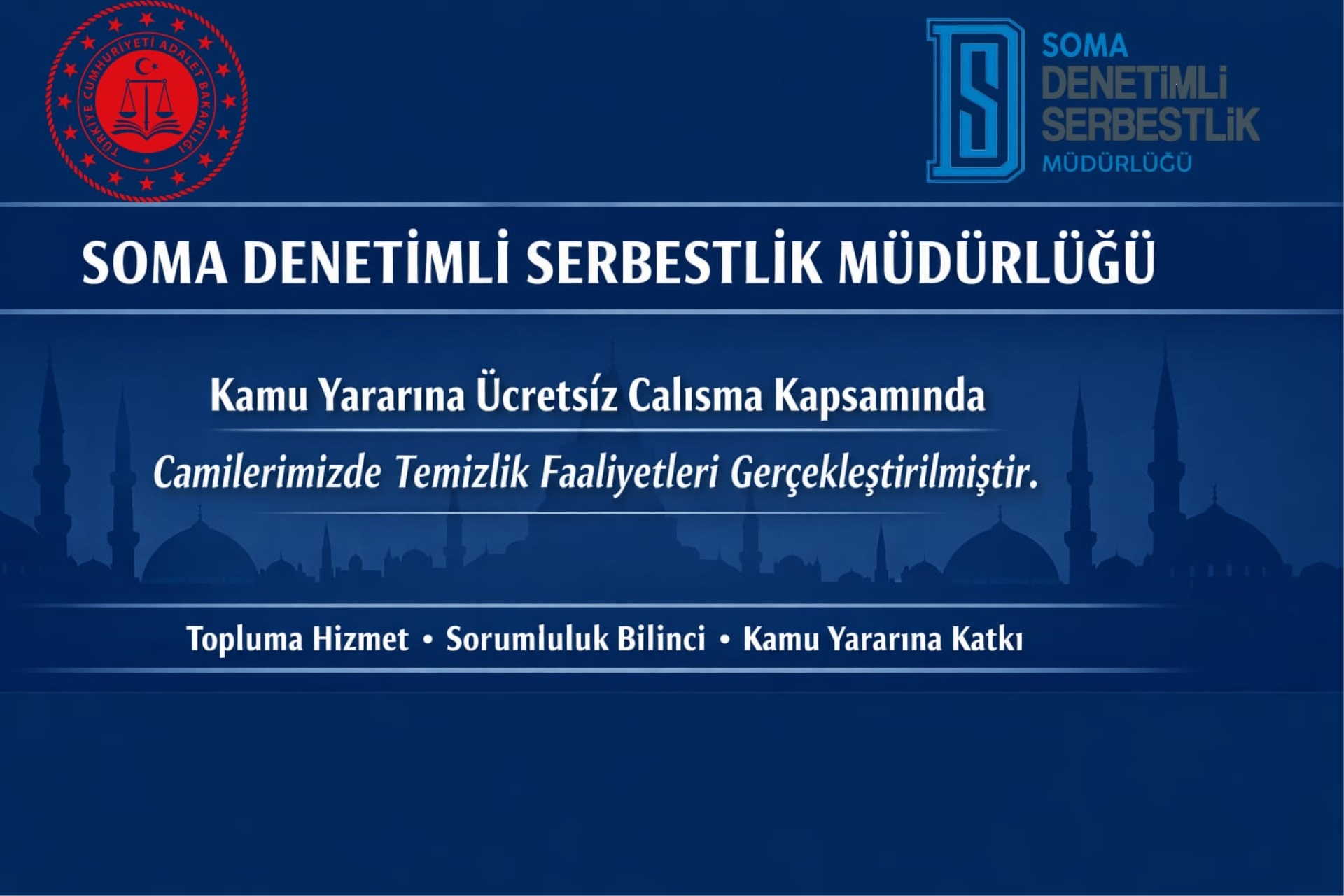 Soma Cumhuriyet Başsavcılığı Soma Denetimli Serbestlik Müdürlüğü tarafından yürütülen kamu yararına ücretsiz çalışma yükümlülüğü kapsamında bulunan yükümlülerce, Ramazan ayı münasebetiyle ilçemizde yer alan Hicret Camii, Uhud Camii, Sanayi Camii, Kubbeli Camii ve Turgutalp Camii'nde temizlik faaliyetleri gerçekleştirilmiştir.